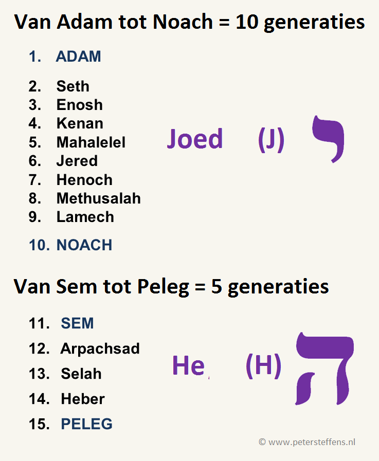 In Genesis 5 en 10 bevinden zich een geslachtregister met respectievelijk 10 en 5 generaties. Deze getallen staan voor de Hebreeuwse letters Joed (het joetje) en he (het heitje). Samen vormen deze letters de korte vorm van Gods naam: יה (JaH).