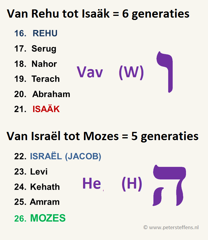 Na de Here Jezus komt de Heilige Geest. De letter he (ה) is een ademstoot. Deze letter wijst naar Gods Geest. Na Izaäk komen nog 5 generaties tot Mozes.