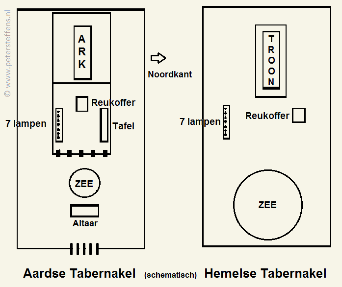 Hoewel deze schematische voorstelling niet op schaal is, geeft het wel weer wat de overeenkomsten zijn tussen de aardse tabernakel en de hemelse tabernakel.